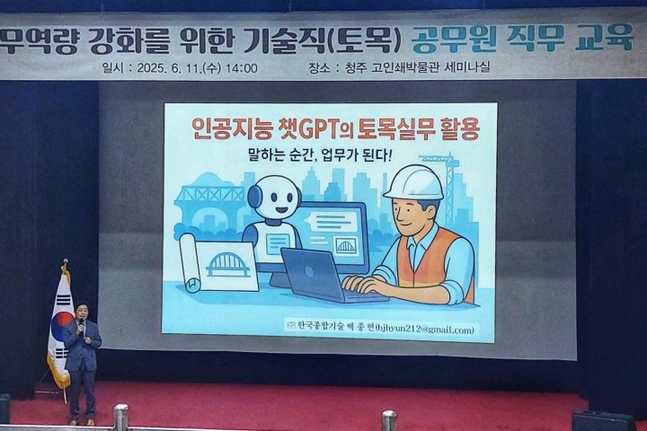 6월 11일 청주고인쇄박물관에서 진행한 'AI 토목실무 활용' 교육이 성황리에 마무리 되었습니다! 🚀 ChatGPT를 활용한 수해피해 조사부터 교량·호안공법 선정까지, 현장 공무원들의 뜨거운 호응 속에 실무 중심 교육을 완주했습니다.